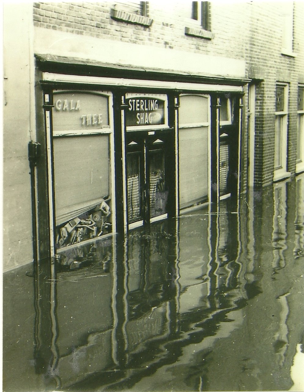 Kerkring. Het water steeg tot boven de bovendorpel van de winkeldeur. Aan het
